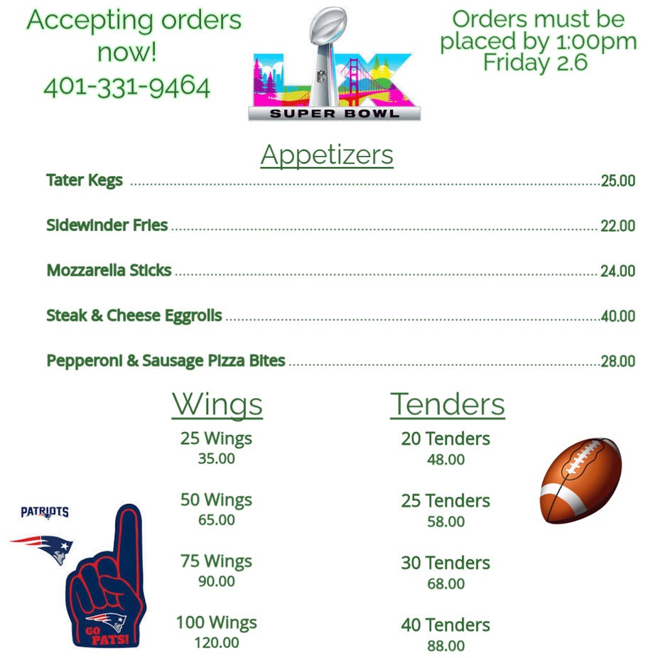 Gear up for the Super Bowl 2026! Don't get sidelined by the cooking—pre-order your game day food today! 🏈Go Pats!!